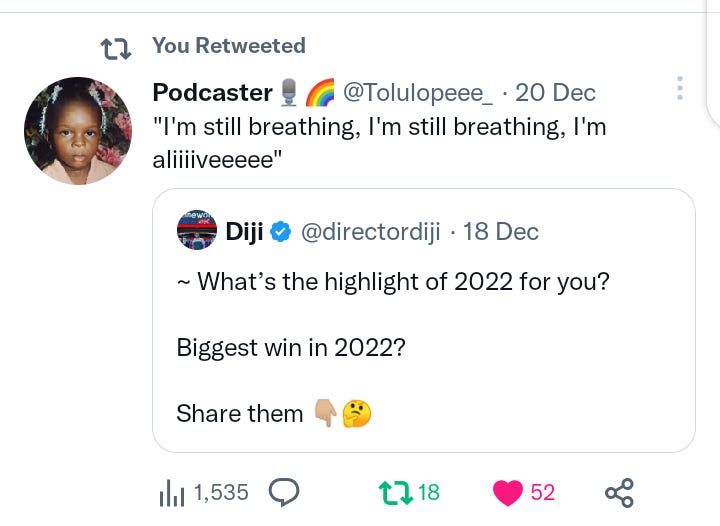 A lot has happened this year for real. Both good and bad, coupled with the fact that I set quite some unrealistic goals this year. My eyes have seen SHEGE (capital letter for emphasis on how the shege has sheged me) I can't even remember most of the things that happened, but special thanks to God for not making us look like what we go through. If I'm to type exactly how I feel I'll say I feel unfulfilled